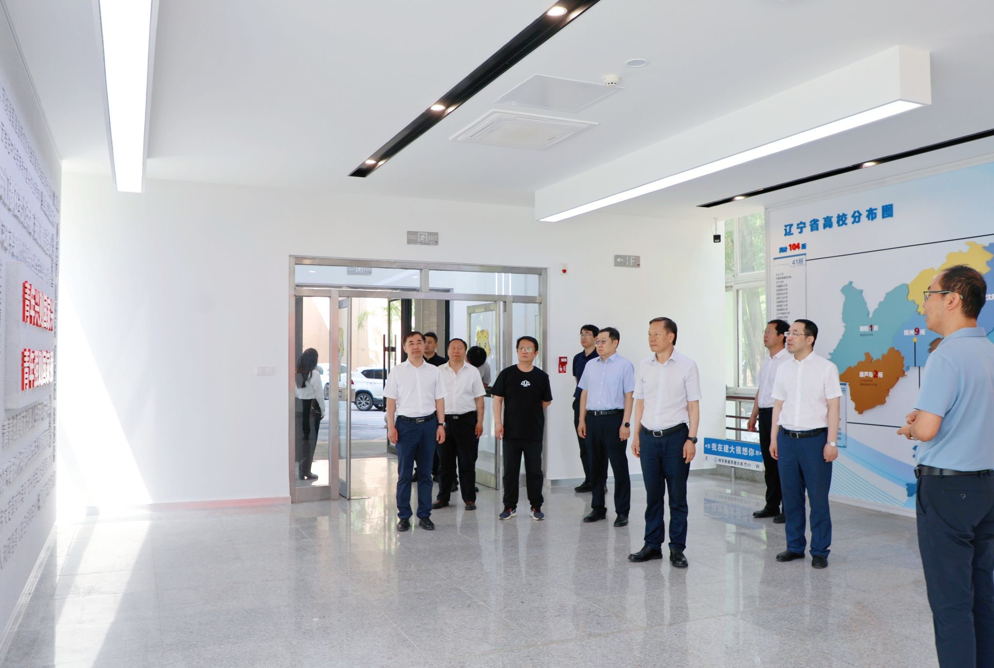 6月20日,学校党委书记董玉宽,校党委副书记张佩栋,党委常委、副校长夏柏树、王凤池、栾方军,党委常委、宣传部部长、党政办主任肖阳一行到升级改造后的省高校网络思政中心调研指导。