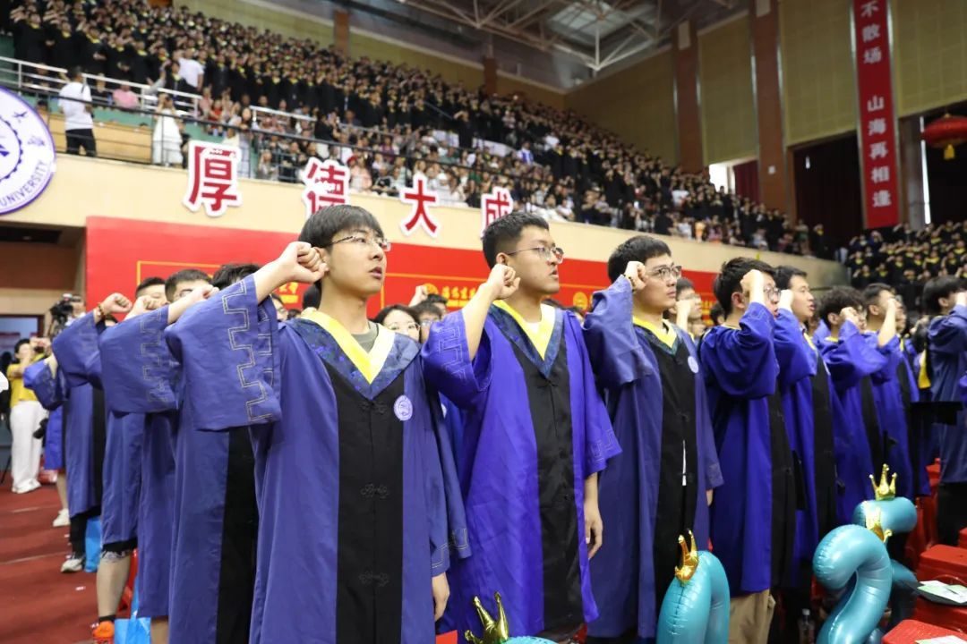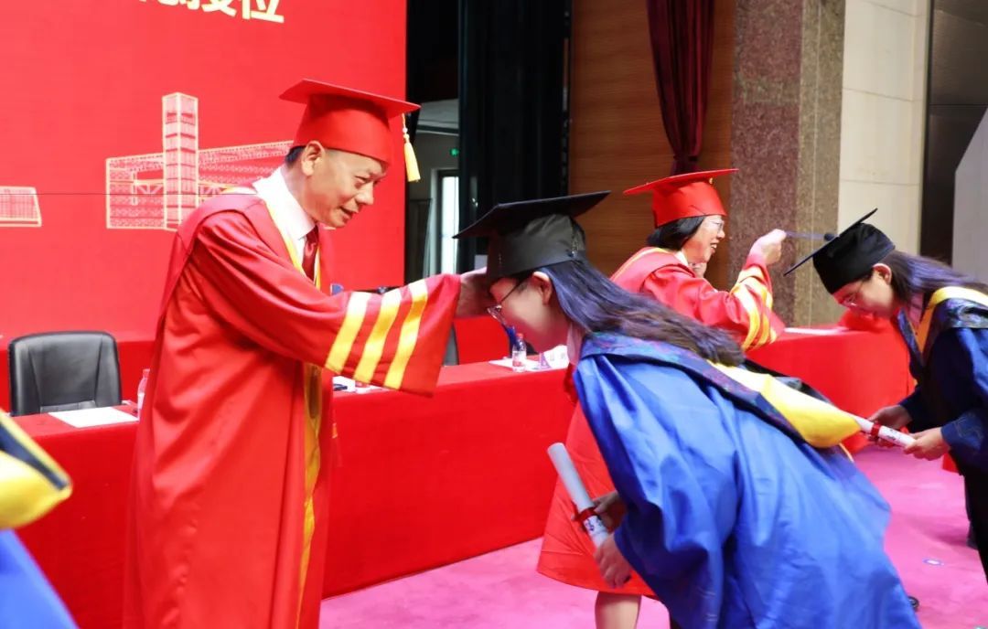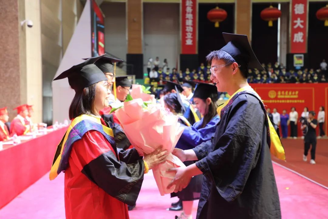 典礼上,各学院领导为所在单位毕业生拨穗授位。毕业生代表向教职员工代表献花致谢。全体毕业生庄严宣誓,表达了勇做挺膺担当奋斗者的拳拳之心。典礼前,全体师生共同观看了毕业生主题短片和师生代表倾情演绎的快闪节目,过往回忆泛起层层涟漪,涌现着对母校的款款深情。