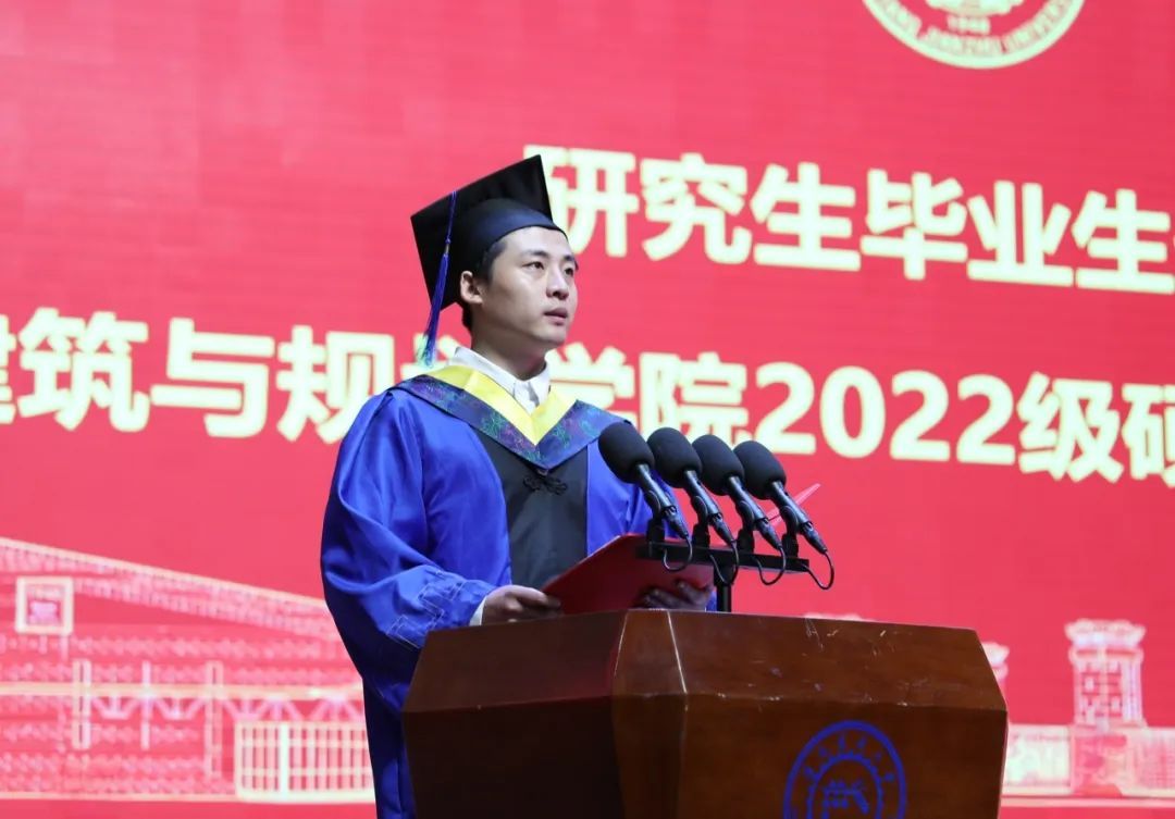 建筑与规划学院城市规划专业2022级硕士研究生姜熹渝代表全体毕业研究生发言。他追忆了在建大求学的八年时光,感谢母校的培养和老师们的倾心教导,让他学会探寻真理、求是创造,懂得自强不息、厚德载物,表示将不断开拓进取,未来成为眼里有光、心中有梦、脚下有路的建大人。