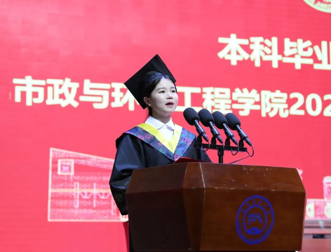 市政与环境工程学院建筑环境与能源应用工程专业2021级本科生孙卓雅代表全体本科毕业生发言。她分享了在建大学会的“求真”“求善”“求美”三堂课,表示将牢记嘱托、不忘师恩,怀揣母校赋予的底气和勇气奔赴山海,用实际行动交出无愧于内心、无愧于他人、无愧于时代的优异答卷。