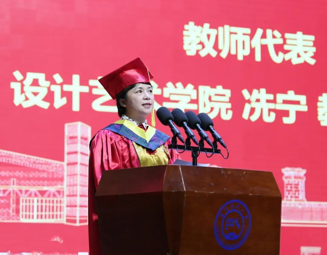 设计艺术学院教授冼宁代表全体教师发言。她希望毕业生们要坚守厚德之念,永葆好奇之心,秉持破壁之勇,带着“博学善建、厚德大成”的校训烙印,拥抱未来、探索前行,用智慧和行动不断超越自我,勇于创新突破,实现所有梦想,尽己所能让世界更加美好。