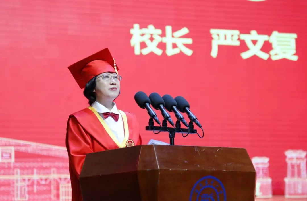 校长严文复宣布了2025届学生获得学位情况。她代表学校向全体毕业生送上美好祝福,向悉心培育学生们成才的老师表示崇高的敬意,向对学校人才培养工作给予大力支持的家长、广大校友和社会各界朋友表示衷心感谢。她以“做好自己人生的‘设计师’”为题,用“责任、坚韧、实干”三个关键词,为毕业生们送去嘱托与期许: