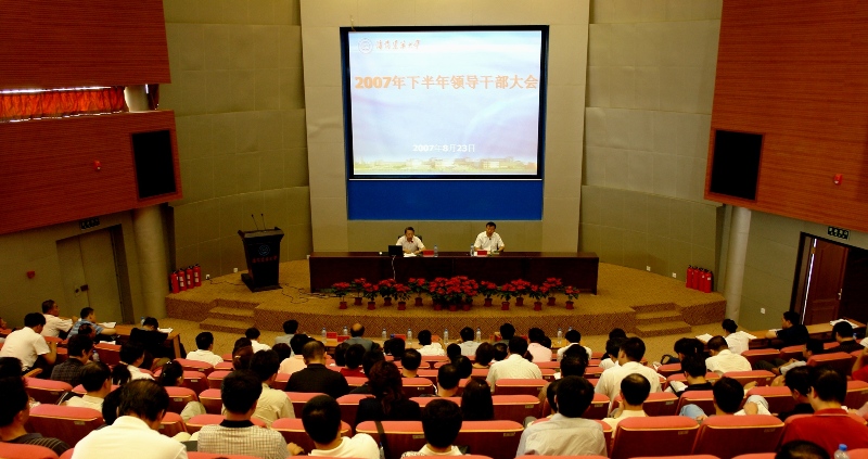 8月23日,学校在科学会堂召开2007年下半年领导干部大会。学校领导张福昌、吴玉厚、王强、刘万东、刘军、李成滨、王宝令、石铁矛、郑朝方,副处级以上领导干部、教学三岗以上教师近300人参加会议。会议对2007年下半年学校主要工作进行了部署,并宣布了省委对我校领导班子调整的决定。我校原党委副书记王军被任命为沈阳理工大学校长兼党委副书记,团省委原副书记王强被任命为我校党委副书记。