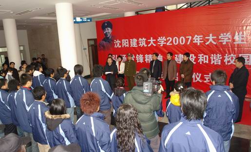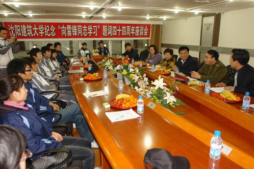 3月4日,室外雪花飞舞,室内暖意融融。沈阳建筑大学为纪念毛泽东为雷锋题词44周年,在雷锋庭院隆重举行了“学习雷锋精神,建设和谐校园”主题活动月启动仪式。仪式开始前,党委书记张福昌亲切接见了与会的来宾。校外辅导员、雷锋班第十五任班长李仕库、抚顺市雷锋小学79岁的老校长刘桂菊、党支部书记喻晓梅、学校党委副书记刘万东和学生代表共同座谈学习雷锋的心得体会。